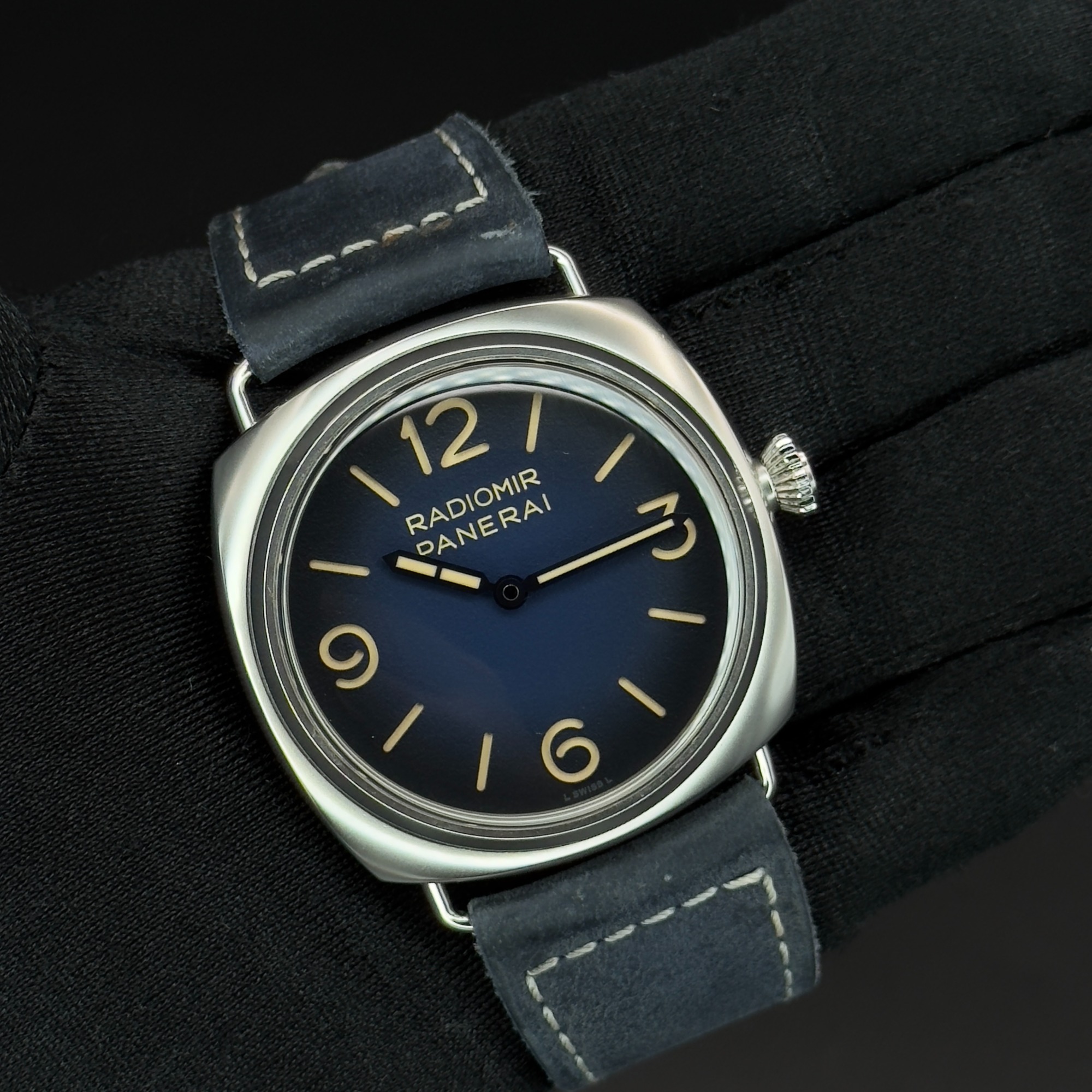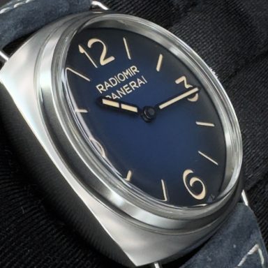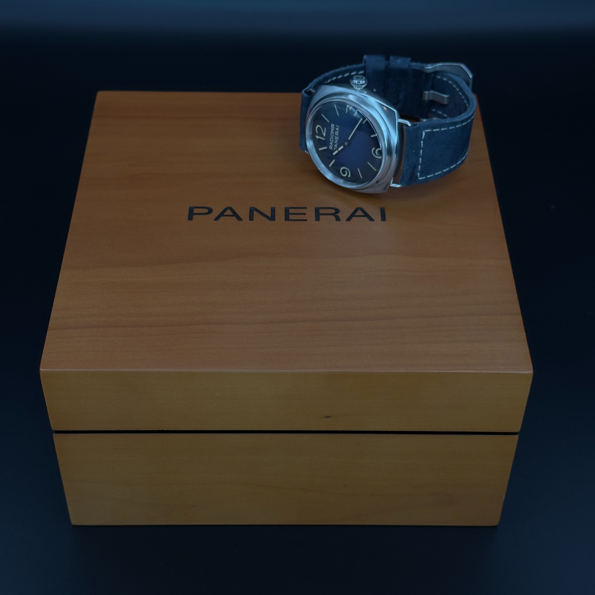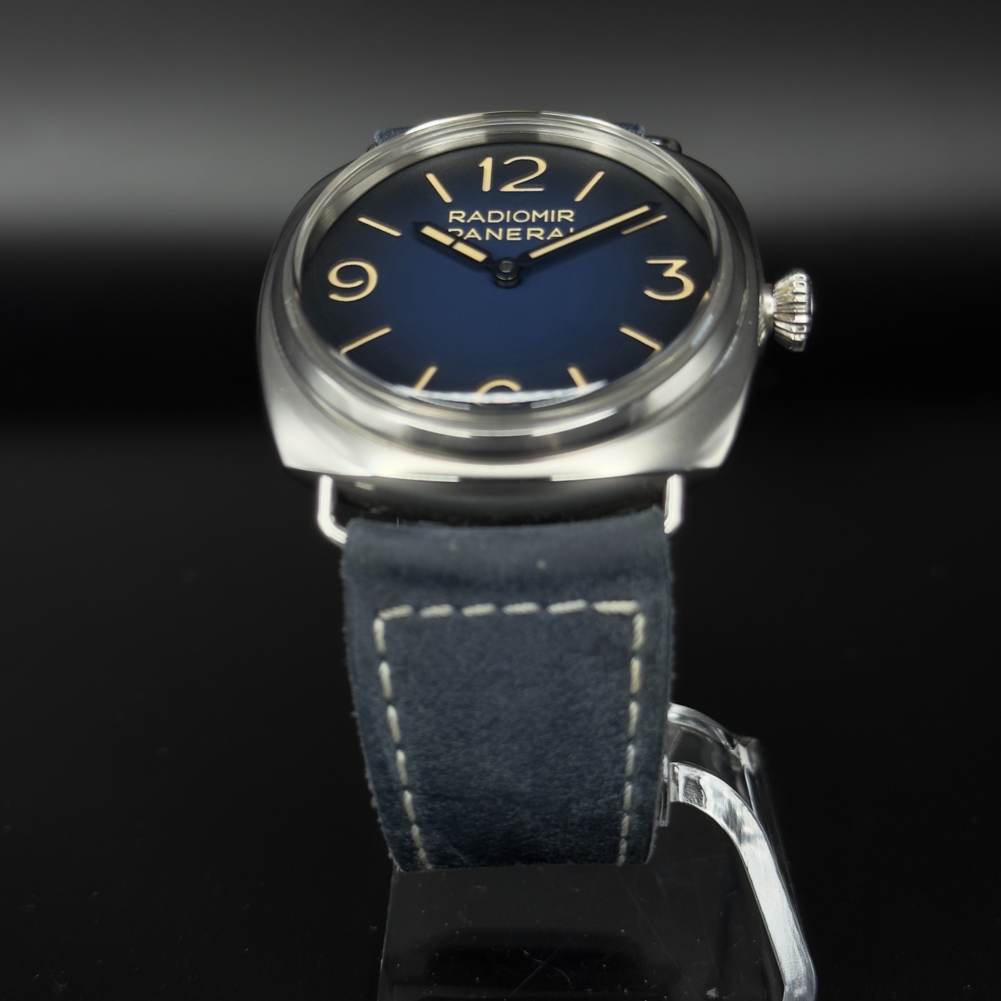 - Dial: Gradated blue with luminous Arabic numerals and hour markers. The dial features Panerai's classic "sandwich" construction.